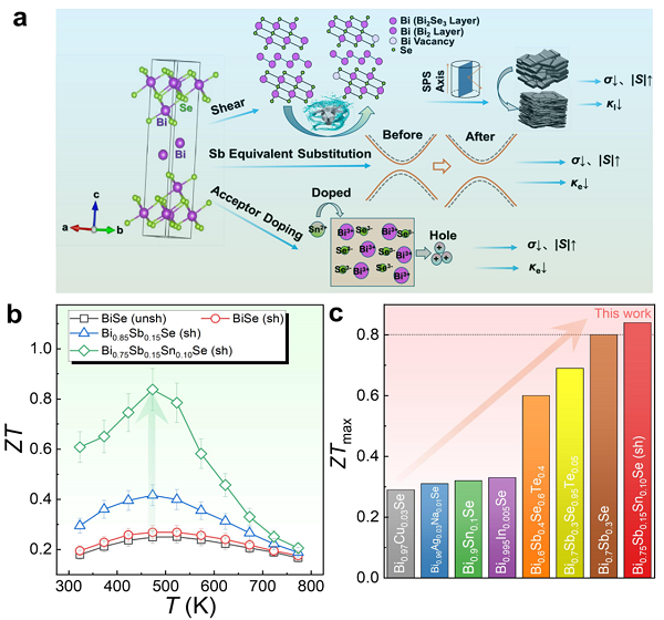 图1所示。介绍了提高BiSe近室温热电性能的有效三重策略。(a)剪切剥离、Sb等价掺 (SbBi)和Sn受主掺杂(SnBi)三重策略的说明。其中SPS为放电等离子体烧结的缩写,σ为电导率,|S|为绝对塞贝克系数,κl为晶格热导率,κe为电子热导率。(b)三重策略后BiSe的温度与热电优值ZT的关系。这里的“unsh”和“sh”分别是指没有剪切剥离和有剪切剥离过程的BiSe。(c) 本文与文献报道的最大ZT (ZTmax)比较