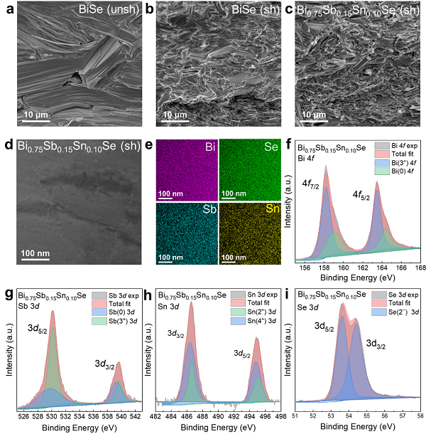 图4。 BiSe的结构特征及Bi0.75Sb0.15Sn0.1Se中不同元素的价态。断裂面扫描电镜(SEM)图 (a)无剪切剥落的BiSe,(b)剪切剥落的BiSe,和(c)剪切剥落的Bi0.75Sb0.15Sn0.1Se。(d)聚焦离子束(FIB)技术制备的Bi0.75Sb0.15Sn0.1Se剪切剥离切片样品的透射电镜(TEM)明场(BF)图像。(e) Bi、Se、Sb和Sn元素对应的能量色散X射线能谱图。剪切剥离Bi0.75Sb0.15Sn0.1Se的X射线光电子能谱(XPS)结果为(f) Bi 4f, (g) Sb 3d, (h) Sn 3d, 和 (i) Se 3d。
