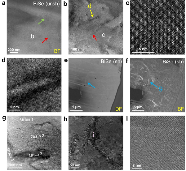 图 5。 未剪切剥离和剪切剥离的BiSe的微/纳米结构特征。(a) 利用FIB技术制备的无剪切剥离BiSe切片样品的TEM-BF图像。红色箭头表示潜在界面,绿色箭头表示存在对比度差异的区域。(b) 取自a的对应的放大的TEM图像。黄色箭头表示潜在的晶体缺陷。(c) 取自b的高分辨率TEM (HRTEM)图像。(d) 取自b的晶格缺陷HRTEM图像。(e) 采用FIB技术制备的剪切剥离BiSe的暗场(DF)和(f) BF图像。蓝色箭头表示对比度不同的区域。(g) 取自f的放大的TEM图像。(h) 取自高度畸变区域的TEM图像。(i) 取自h的高分辨率球面像差校正扫描TEM (Cs-STEM) BF图像。