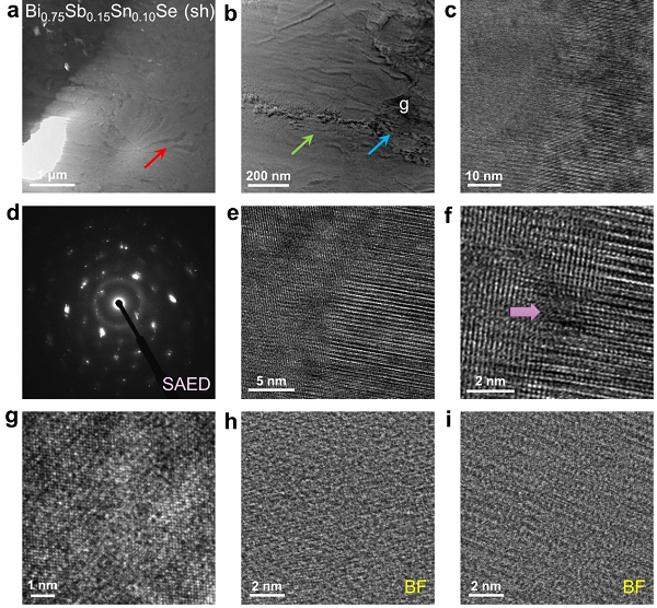 图 6。 剪切剥离的 Bi0.75Sb0.15Sn0.10Se的微/纳米结构特征。(a) 用FIB技术制备的切片样品的TEM图像。红色箭头表示存在对比度差异的区域。(b) 相应的放大TEM图像。绿色箭头表示潜在边界,蓝色箭头表示高度畸变区域。(c) 小角度晶界的HRTEM图像。(d) 相应的选区电子衍射(SAED)图案。(e) 大角度晶界的HRTEM图像。(f) 相应的放大HRTEM图像。箭头表示晶界处潜在的晶格畸变。(g) 取自b中高度畸变区域的HRTEM图像。 (h-i) 从两个不同的高度扭曲区域拍摄的Cs-STEM BF图像。