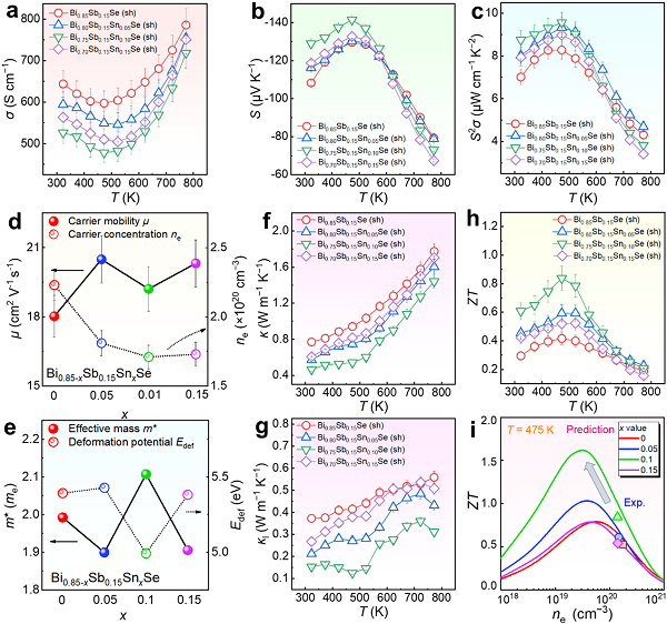 图8。剪切剥离Bi0.85−xSb0.15SnxSe (x = 0, 0.05, 0.10和0.15)的热电性质。与温度相关的 (a) σ, (b) S,和(c) S2σ。与x有关的室温条件下的 (d) 载流子浓度ne和迁移率μ,和 (e) 有效质量m*和变形势Edef。与温度相关的 (f) κ,(g) κ1,(h) ZT。(i) 理论预测ZT与实验ZT随ne的函数比较。