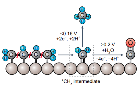实现C(sp3)-C(sp3)和C (sp3)−H键的选择性电催化活化是实现电驱动化学品合成、塑料可持续升级和开发使用高能量液体燃料的燃料电池的关键。以前的研究表明,在铂电极上吸附烷烃后形成两种表面物种;这些物种的区别在于它们在还原条件下脱附的能力。阴极可解吸部分可以在还原条件下作为饱和烷烃或在氧化条件下作为CO2除去,而非阴极可解吸部分只能通过完全氧化为CO2除去。但依旧缺乏了解如何控制这些表面上的物种的后续转化。美国威斯康星大学麦迪逊分校化学与生物工程系和化学系的Victor M. Zavala、Marcel Schreier团队,提供了对烷基片段表面转化中脱氢,C-C断裂和氧化之间复杂相互作用的见解,这将为高效储能和工业反应电气化的催化剂设计提供新的设计思路。相关研究成果以 “Understanding the interplay between electrocatalytic C(sp3)‒C(sp3) fragmentation and oxygenation reactions”为题目发表在国际顶级期刊Nature上。