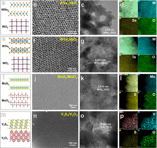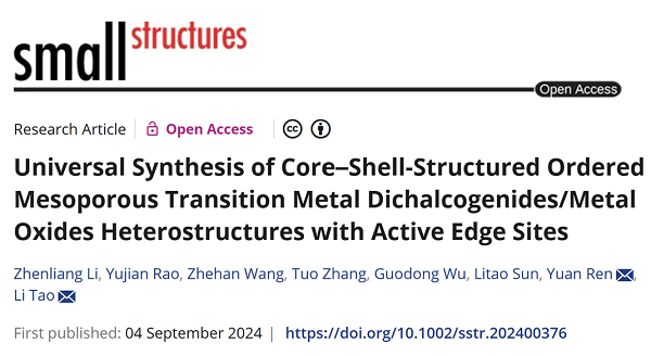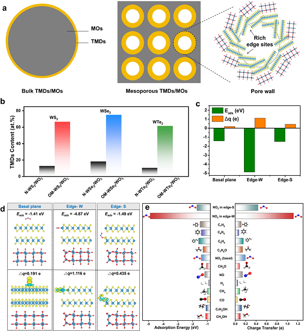 基于此,东南大学任元副研究员、陶立教授(共同通讯作者)报道了通过一步热硫化(硒化/碲化)具有有序介观结构两亲性嵌段共聚物/多金属氧酸盐簇(BCPs/POMs)纳米复合材料,来构建有序介孔TMDs/金属氧化物(OM-TMDs/MOs)半导体异质结构的通用方法,包括WS2/WO3、WSe2/WO3、WTe2/WO3、MoS2/MoO3和V3S4/V2O3。OM-TMDs/MOs具有高度有序的介孔结构,具有高比表面积、大孔径和异质结构框架中丰富的活性边缘位点。基于OM-WS2/WO3的化学电阻式气体传感器在室温下表现出优异的NO2传感性能,具有高灵敏度、超高选择性(SNO2/Sgas>20)和快速响应速度(6 s)。理论研究表明,WS2/WO3异质结构和WS2边缘位点对NO2分子的强吸附能力以及它们之间的高电荷转移有助于传感器的高选择性和灵敏度。这种通用方法为有序介孔TMDs基纳米材料的合成提供了新的策略,在电子器件、催化、储能和转化等各种应用中显示出巨大的潜力。成果发表于Small Structures (IF=13.9), 第一作者是东南大学材料科学与工程学院2022级硕士李振良。
