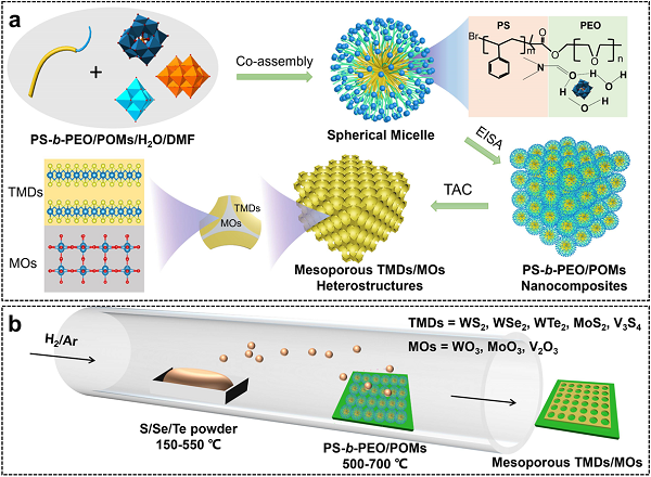 图 1. (a)通过BCPs和POMs团簇的共组装结合TAC工艺合成有序介孔TMDs/MOs异质结构的示意图,(b)TAC工艺图。