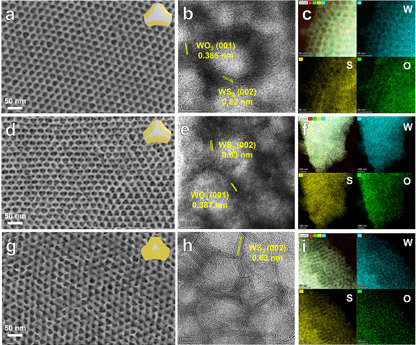 图 2. 有序介孔WS2/WO3的结构表征。(a-c)OM-WS2/WO3-500、(d-f)OM-WS2/WO3-600、(g-i)OM-WS2/WO3-700。