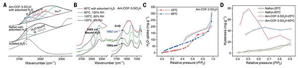 在此,北京理工大学王博教授和冯霄教授(通讯作者)受超嗜热菌的启发,通过与Nafion交织的共价有机框架(COF)可以实现更高的工作温度,从而提高氢空气PEMFCs的功率密度。作者合成了一种α-氨基酮连接的COF(Am-COF),并将它们与 Nafion(Am-COF/Nafion)交织在一起,为 MT PEMFC 创造了“透气”质子导体,其氢键位点可在高温下保留水分,大孔隙可改善氧气运输。添加此COF后,商业化Pt/C阴极在105℃下的额定功率密度提高了近90%。