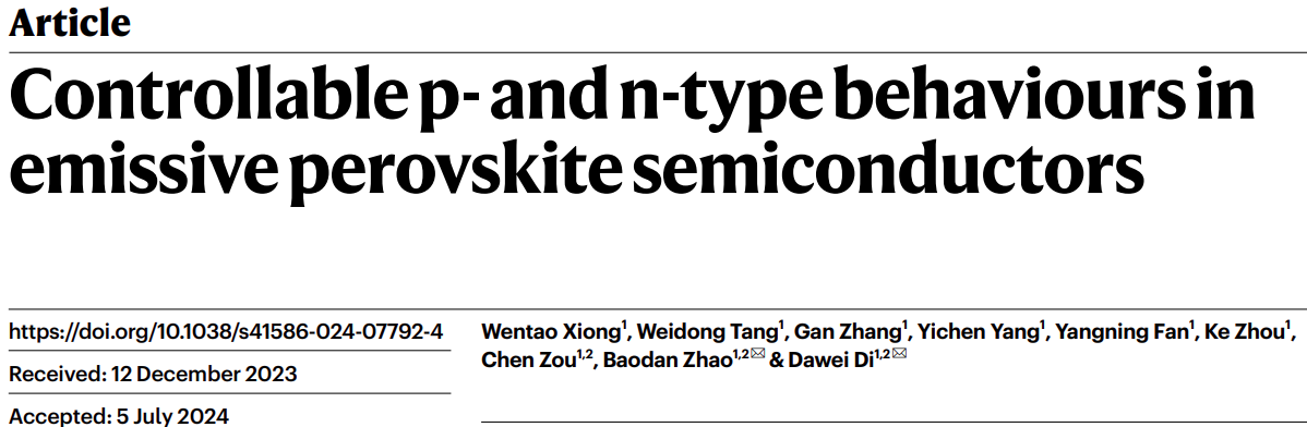 对于半导体如Si和GaN,正(p)型和负(n)型导电性分别通过将电子接受元素和电子给予掺杂到晶格中来实现。对于卤化物钙钛矿,作为一种新兴的半导体,能够很可靠地控制电荷传导行为。卤化物钙钛矿已成为光电设备的超级明星材料,除了在太阳能电池研究的热度之外,这些材料在发光二极管 (LED)、光电探测器和激光器方面也显示出巨大的潜力。浙江大学光电学院的狄大卫教授团队报道了一种宽禁带隙钙钛矿半导体,其可控p-和n-型的特点,可以通过将具有强吸电子能力的掺杂剂进行调整,p型和n型样品的所得载流子浓度超过1013 cm-3,霍尔系数范围从-0.5 m3 C-1(n型)到0.6 m3 C-1(p型)。观察到费米能级在带隙中的位移,重要的是,实现了从n型到p型导电性的转变,同时保持了70- 85%的高光致发光量子产率。在发射钙钛矿半导体中的可控掺杂使得能够在具有简单架构的钙钛矿发光二极管中展示出超高亮度(超过1.1 × 106 cd m−2)和卓越的外部量子效率(28.4%)。相关研究成果以 “Controllable p- and n-type behaviours in emissive perovskite semiconductors”为题目发表在国际顶级期刊Nature上。