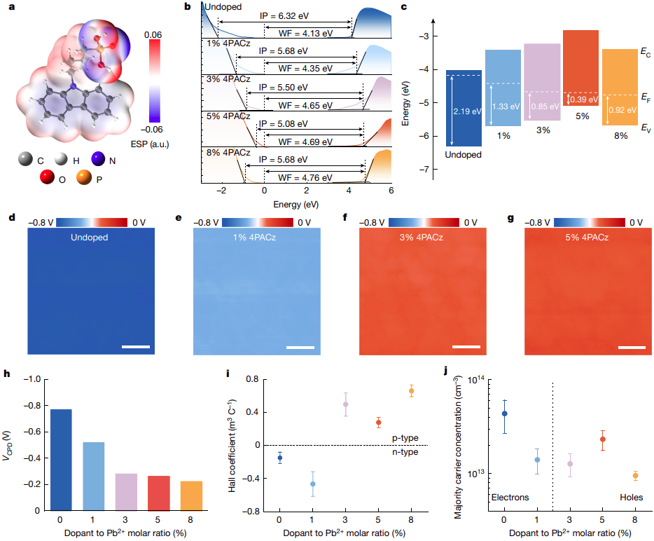 图1 通过分子掺杂在宽带隙钙钛矿中的n型到p型转变。© 2024 Nature