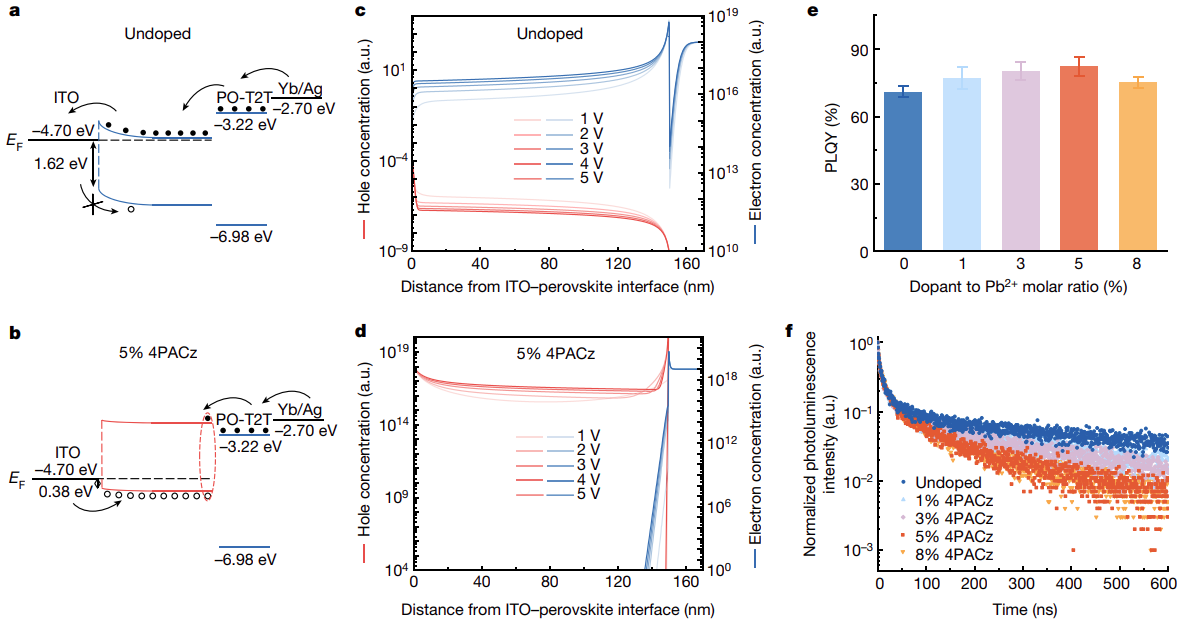 通过引入咔唑-膦酸分子掺杂剂4PACz来控制宽带隙钙钛矿中的p型和n型行为,证明了在宽带隙钙钛矿半导体中电导率从n型到p型的连续转变。DFT计算表明,在4PACz上的膦酸基团与未配位的Pb2+形成强键,从而有效地充当钙钛矿半导体的电子受体。重要的是,实现了从n型到p型导电性的转变,同时保持了70- 85%的高PLQYs。这种卓越的全能器件与其他种类的溶液处理LED(包括OLED和QD-LED)相比具有显著的优势。除了在本文中这些初步的演示,钙钛矿半导体的可控掺杂有望为新一代光电器件打开大门。