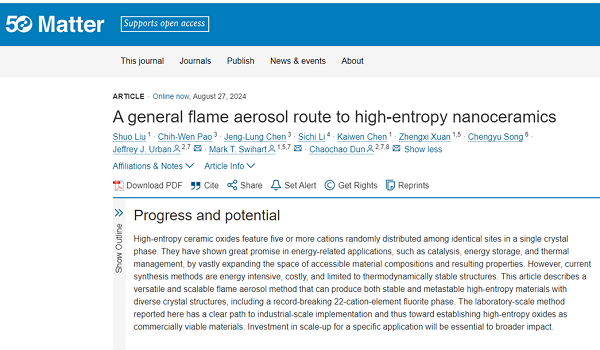 本文开发了一种通用的非平衡火焰合成方法制备高熵陶瓷材料,在能源,环境等领域具有广泛的应用前景。同时,火焰喷雾热解是工业上最常用的制备纳米材料的方法,其一步、连续、低成本、可拓展的合成方式为本文的技术路线奠定工业化基础。