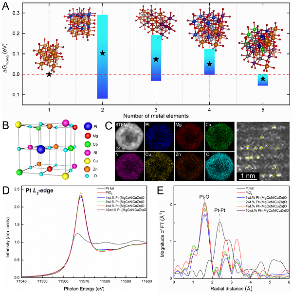 如图5所示,材料构型熵的增加会极大地增强不混溶元素在高熵氧化物中的分散性,并实现单原子分布状态。例如,Pt活性位点在(MgCoNiCuZn)O高熵石岩载体中呈现十分良好的单原子分散,并实现超过10 wt.%的负载量。