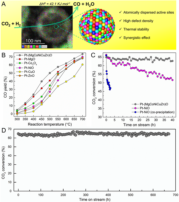 如图6所示,上述所制备的高熵单原子催化剂具有十分明显的优势。在CO2加氢催化应用中,其活性和稳定性明显高于二元催化剂和传统催化剂,可以在600ºC的反应条件下维持超过670小时的恒定的催化性能。