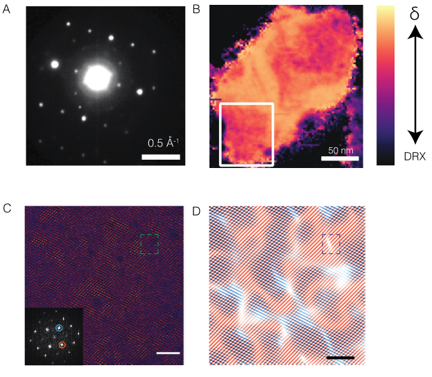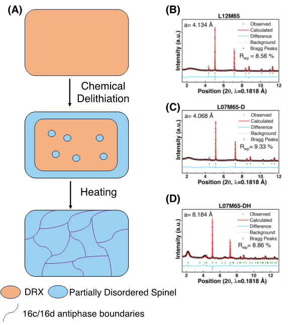 在此工作中,通过原子分辨率扫描穿透式电子显微镜 (STEM) 和扫描电子纳米衍射 (SEND) 进行的深入原子表征研究,展示了一种高锰含量的 DRX 可以转变为一种独特的纳米结构材料,该材料中由相干长度为 3 到 7 nm的反相边界组成无序尖晶石域。这种微观结构将锂化热力学和电压曲线所决定的(纳米)长度尺度与颗粒尺寸解耦,保持颗粒足够大以实现良好的循环性能。纳米尺寸尖晶石状域的小相干长度将常规尖晶石的两相反应改变为固溶体,从而消除了一个主要障碍,使得此材料在大颗粒尺度下实现高能量密度和倍率性能。文章将这种结构称为δ相,并展示它可以通过化学脱锂和低温加热的两步过程实现。