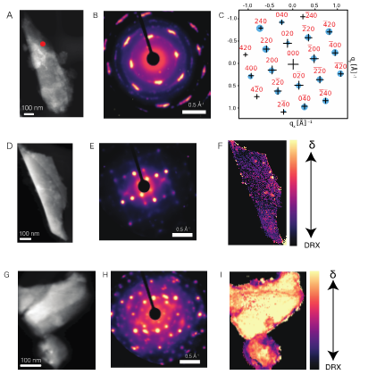 为了更详细地了解样品在化学脱锂和加热过程中的结构演变,文章对 L12M65(初始样品)、L07M65-D(脱锂后)和 L07M65-DH(脱锂后经 200°C 加热处理)进行了四维扫描电子纳米衍射(SEND)表征。图 3A 显示了 L12M65 的高角环形暗场(HAADF)图像,SEND 图案在此基础上进行了收集。这个颗粒的衍射图案的平均值显示在图 3B 中。尖锐的衍射点表明原始 DRX 颗粒具有很高的结晶度。平均衍射图案显示衍射点上有弧形,表明这个主要为单晶的颗粒有轻微的面内旋转变化。从图3A 中标记为红点的区域选出的衍射图案(所有图案均可归为岩盐结构)显示并标定在图 3C 中,表明没有其他相的存在。