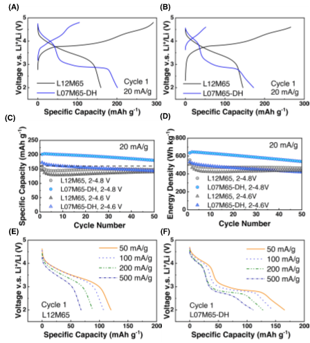L07M65-DH 和 L12M65 的电化学性能通过在 20 mAh/g 的电流密度下在 2-4.8 V 范围内进行的恒电流循环性能。两个样品在制作成正极后都保留了约 5μm 的平均颗粒大小。如图 5A 所示,L07M65-DH 在首次放电中得到了 201 mAh/g 的容量,显著高于 L12M65 的 159 mAh/g。这一改进在 2-4.6 V范围内也得以保持(图 5C)。L12M65(黑色)显示出斜坡型电压曲线,而 L07M65-DH(蓝色)显示出类似平台的 4 V 和 3 V 区域,且 3 V 区域比 4 V 区域长。L07M65-DH 在循环过程(图5D)中达到了更高的能量密度(在 2-4.8 V 范围内为 645 Wh/kg,相比之下 L12M65 为 555 Wh/kg)。另外,从 L12M65 到 L07M65-DH 的容量增加的同时,倍率性能也得到提高。通过测试 L12M65 和 L07M65-DH 在 50 mA/g 到 500 mA/g 范围内的电流密度下的性能发现,虽然原始的 L12M65 在 500 mA/g 下仅放出68 mAh/g容量(20 mA/g 的 43%)(图 5E),但转变为 L07M65-DH 后,在 500 mA/g 下容量提高到 110 mAh/g(图 5F)。这样的高能量和快充/放电能力之前仅在纳米尺寸 DRX 材料中获得,但在微米尺寸颗粒中从未实现过。