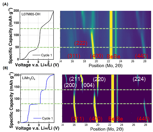 为了了解电化学循环过程中的结构变化,图 6A展示了在 L07M65-DH 于 1.5-4.8 V 范围内进行循环时获得的原位XRD数据。为了比较,图 6B 显示了在相同条件下有序 LiMn₂O₄ 尖晶石的原位XRD数据。对于 L07M65-DH,(222)、(400) 和 (440) 峰在锂插入过程中持续向低角度移动,这与放电过程中晶格参数的增加一致。当放电至 2.7 V 以下时,(400) 和 (440) 峰出现分裂,指示出四方相的形成。然而,立方相和四方相的晶格参数在放电过程中持续变化,表明系统始终保持固溶体状态。相比之下,图 6B 中 LiMn₂O₄ 的数据显示,(311)、(400) 和 (440) 峰在经过 3 V 平台区域时保持在相同的角度,同时它们的强度逐渐减少,表现出两相反应的特征。