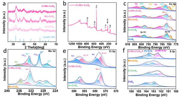 图2 (a) Cr/Mo-CoS2的XRD谱图;(b-f) Cr/Mo-CoS2、Cr -CoS2、Mo-CoS2和CoS2的Co 2p、Mo 3d、Cr 2p和S 2p的高分辨率XPS谱图