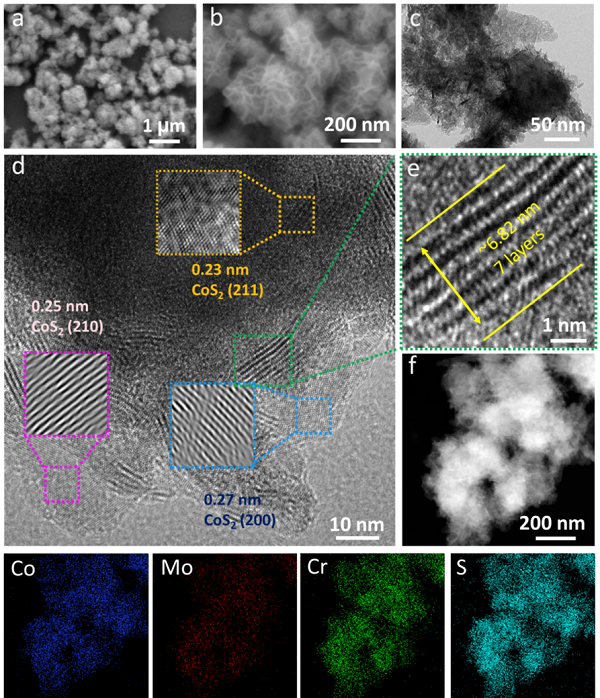 图3 (a-b) Cr/Mo-CoS2的SEM图像;(c-e) Cr/Mo-CoS2的TEM和HRTEM图像;(f) Cr/Mo-CoS2的HAADF- STEM图像和相应的EDS-mapping图像