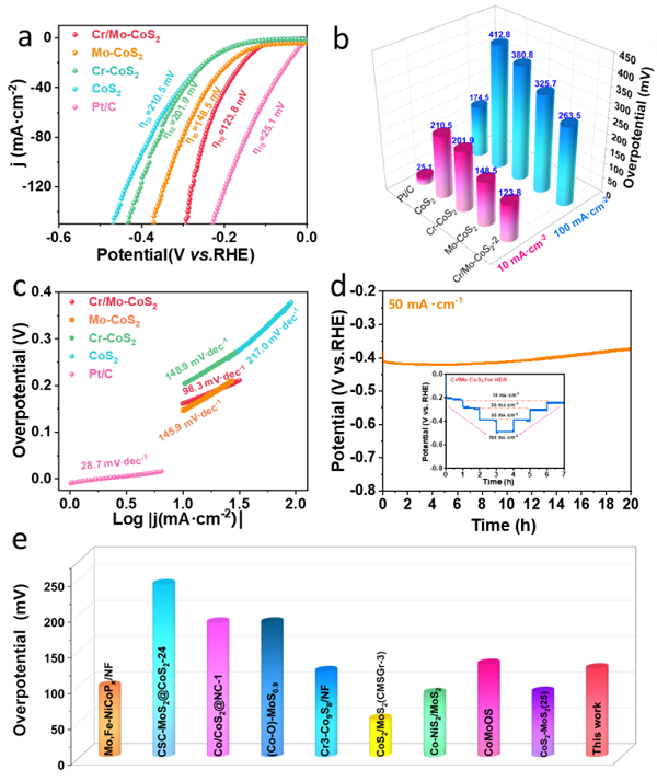 图4 (a)催化剂的LSV曲线;(b)催化剂在电流密度为10 mA·cm-2和100 mA·cm-2时的过电位;(c) HER催化剂的Tafel斜率曲线;(d) 1 M KOH中 Cr/Mo-CoS2的稳定性测试;(e) Cr/Mo-CoS2与已报道的Co基电催化剂的HER性能比较