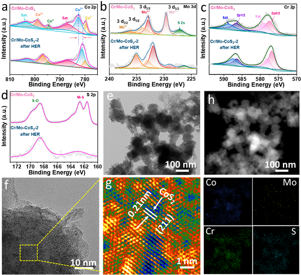 图5 Cr/Mo-CoS2和HER反应后的Cr/Mo-CoS2的 (a) Co 2p, (b) Mo 3d, (c) Cr 2p和(d) S 2p XPS光谱图;(e-g) HER反应后Cr/Mo-CoS2的TEM和HRTEM图像;(h) HER反应后Cr/Mo-CoS2的HAADF-STEM图像和相应的EDS-mapping图谱