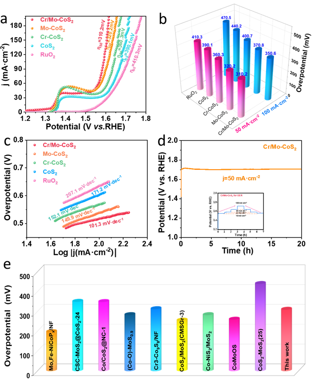 图6 (a) OER催化剂的LSV曲线;(b) 催化剂在电流密度为50 mA·cm-2和100 mA·cm-2时的过电位;(c) OER催化剂的塔菲尔斜率曲线;(d) 1 M KOH中 Cr/Mo-CoS2的OER稳定性;(e) Cr/Mo-CoS2与已报道的Co基电催化剂OER性能对比