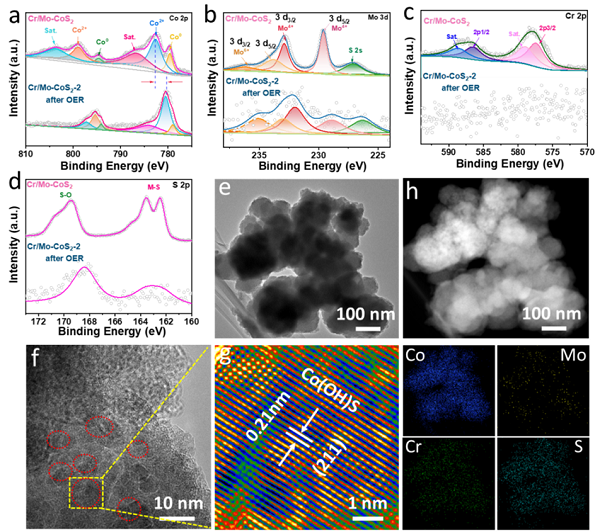 图7 (a-d) OER反应前后Cr/Mo-CoS2、Cr/Mo-CoS2的高分辨率XPS光谱:Co 2p、Mo 3 d、Cr 2p 和S 2p;(e-g) OER反应后Cr/Mo-CoS2的TEM和HRTEM图;(h) OER反应后Cr/Mo-CoS2的HAADF-STEM图像和相应的EDS-mapping图像