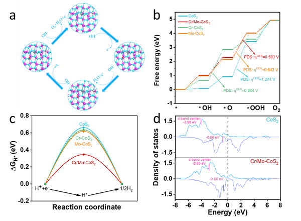 图8 (a) Cr/Mo-CoS2(200)表面OER路径图;CoS2和Cr/Mo-CoS2的(b) OER和 (c) HER自由能图 (d) CoS2和Cr/Mo-CoS2的Co反应位点的d带中心图