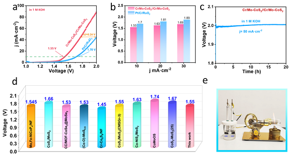 图9在1 M KOH溶液中,Cr/Mo-CoS₂电催化剂作为阴极和阳极组成的双功能全解水器件:(a) 极化曲线;(b) 电压-电流密度对比曲线;(c) 在50 mA·cm-2电流密度下的稳定性;(d) 与已报道的Co基全解水双功能电催化剂性能对比图;(e) 利用火电装置驱动Cr/Mo-CoS₂全解水装置实物照片