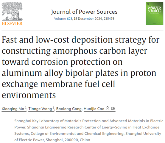 上海电力大学、上海市电力材料防护与新材料重点实验室曹怀杰近年来围绕铝合金双极板表面腐蚀防护开展研究。提出一系列MXene复合涂层(Corrosion Science, 2024, 232: 112044; Journal of Colloid and Interface Science, 2024, 685, 865-878)和非晶碳转换防护涂层(Surface and Coatings Technology, 2022, 445: 128709)的构建方法并揭示其防护机制。在此基础上,提出利用蜡烛灰快速沉积构筑非晶碳层,结合原位腐蚀观测、腐蚀电化学测试、恒电位极化测试、表面形貌及组成分析,研究非晶碳层在模拟PEMFC环境下的腐蚀防护行为及作用机制。相关成果“Fast and low-cost deposition strategy for constructing amorphous carbon layer toward corrosion protection on aluminum alloy bipolar plates in proton exchange membrane fuel cell environments”近期发表在《Journal of Power Sources》上。该研究得到上海市扬帆计划、上海市电力材料防护与新材料重点实验室经费支持。论文第一作者是上海电力大学环境与化学工程学院研究生马晓晴和王天歌,通讯作者曹怀杰。
