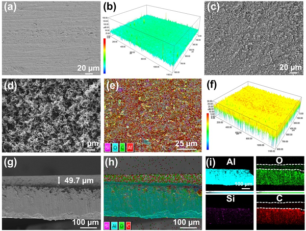 相比于空白Al合金表面 (图1),蜡烛灰沉积后表面粗糙度增大。能谱显示了Al、Si、O和C等元素的分布。Al-C的截面结构显示,非晶碳层的涂层厚度为49.71 μm。表面形貌和能谱图证实了铝合金表面碳的存在。