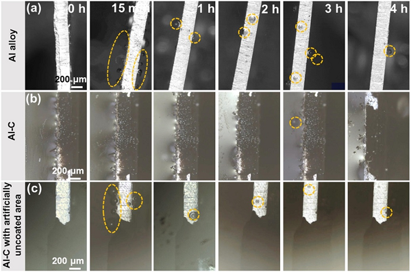 原位腐蚀实验(图3)证明非晶碳层对酸性条件下H+的阻隔作用。空白铝合金表面可观察到氢气泡快速生成。非晶碳层表面修饰后,氢气泡数量较少,生成速率显著降低。在涂层区和无涂层区,对比更为明显。因此,构筑的非晶涂层在酸性环境中具有较强的物理阻隔性。同时,浸泡4h后涂层没有脱落。