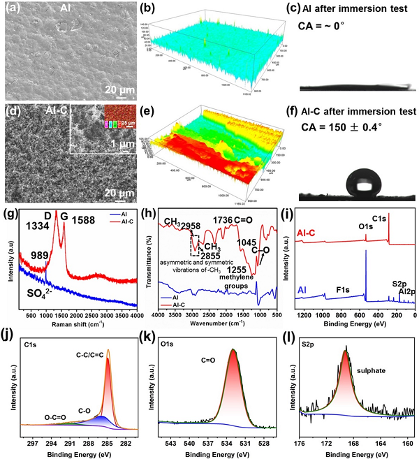 在模拟质子交换膜燃料电池环境中浸泡实验后,在铝表面观察到细小的裂纹和空洞,表面亲水性增强。而非晶碳层样品浸泡后表面形貌结果表明,碳颗粒聚集状态没有改变,表面仍呈现强的疏水性。碳层的存在仍然为腐蚀物质提供了物理屏障。拉曼光谱结果表明铝合金表面硫酸盐腐蚀产物的存在,而Al-C样品表面检测到典型的碳信号峰。从FTIR和XPS结果来看,在酸性环境中浸泡试验后,化学成分和表面官能团没有变化(图4)。因此,由非晶碳纳米颗粒聚集形成的完整结构和疏水碳颗粒的存在使涂层具有超疏水性,为强耐蚀性提供了条件。