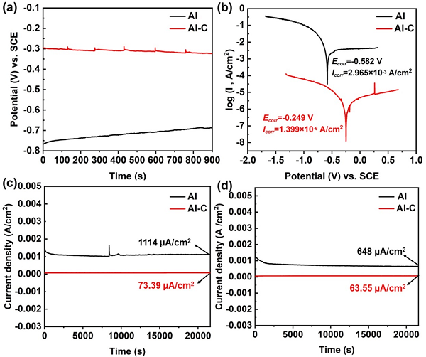 Al和Al- C在高温(60℃)下的开路电位和极化曲线如图5所示。60℃酸性溶液中Al-C的Ecorr值为-0.249 V, icorr值降至1.399×10-6 A/cm2。正的Ecorr值和低的icorr值表明,在酸性环境中非晶碳涂层增强了铝合金的耐蚀性。在超过20000s恒电位极化测试后,Al和Al- C样品都呈现稳定的电流密度。经过长期极化测试,Al- C样品在酸性溶液中表现出比Al合金更低的电流密度,证实其稳定的耐腐蚀性能。