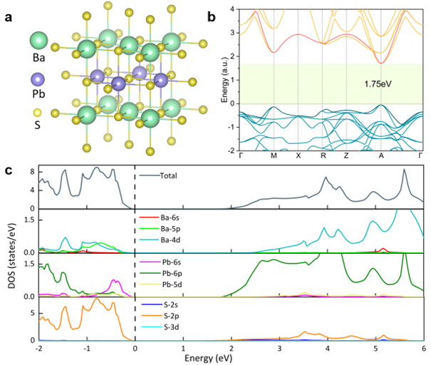 Figure 1. (a) Crystal structure model of Ba0.5Pb0.5S alloy. (b) Band structure of Ba0.5Pb0.5S alloy. (c) Density of states (DOS) of Ba0.5Pb0.5S alloy.