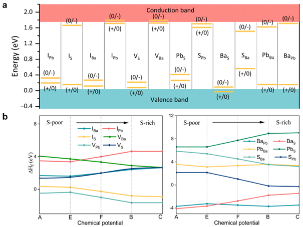 Figure 2. (a) Calculated charge-state transition levels of intrinsic defects in Ba0.5Pb0.5S alloy. (b). Defect formation energy of Ba0.5Pb0.5S alloy at S-rich and S-poor conditions.