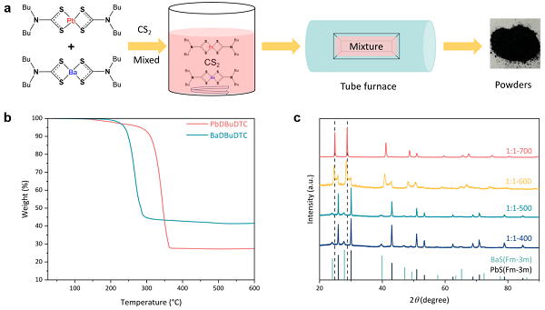 Figure 3. (a) Schematic illustration of the preparation scheme of Ba0.5Pb0.5S alloy. (b) TGA profiles of PbDBuDTC and BaDBuDTC. (c) XRD patterns of Ba0.5Pb0.5S alloy at different reaction temperatures.