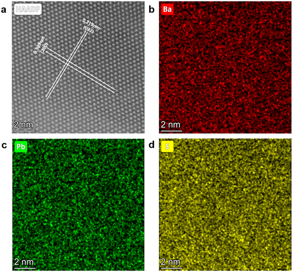 Figure 4. HAADF-STEM image and EDS elemental mappings of Ba0.5Pb0.5S alloy.