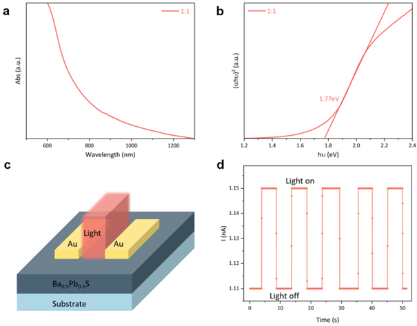 Figure 5. (a) Absorption spectrum of Ba0.5Pb0.5S alloy. (b) Band gap estimation of Ba0.5Pb0.5S alloy. (c) Photodetector based on Ba0.5Pb0.5S alloy. (d) Dynamic response of the device upon on-off switching of 365 nm LED.