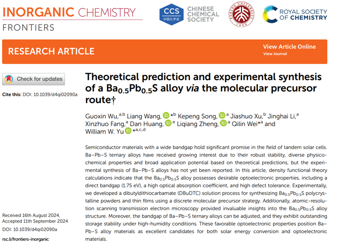Ba-Pb-S三元合金因其强大的稳定性、多样的理化性质和基于理论预测的广泛应用潜力而受到人们的关注,但关于Ba-Pb-S合金的实验合成尚未见报道。文章通过密度泛函理论计算表明,Ba0.5Pb0.5S合金具有良好的光电子性能,包括直接带隙(1.75 eV)、高光吸收系数和高缺陷容差。在实验中,我们开发了一种二丁基二硫代氨基甲酸盐(DBuDTC)溶液工艺,利用离散的分子前驱体策略成功制备了Ba0.5Pb0.5S多晶粉末和薄膜。实验测得Ba0.5Pb0.5S合金具有1.77 eV的光学带隙值,并展现出p型半导体特征。通过将Ba摩尔比从2:1调整到1:2,可以将合金的带隙从2.10 eV减少到1.50 eV。此外合金在高湿度条件下表现出优异的存储稳定性。在1V的偏置电压下,由Ba0.5Pb0.5S制备成的光电探测器显示出非常低的暗电流(1.11 nA)和较高的光电流开/关重复性,计算的响应率为R=1.77×10-6A/W,比探测度为D*=1.45×107Jones。这些发现为该合金在光电器件中的潜在应用开辟了可能性。