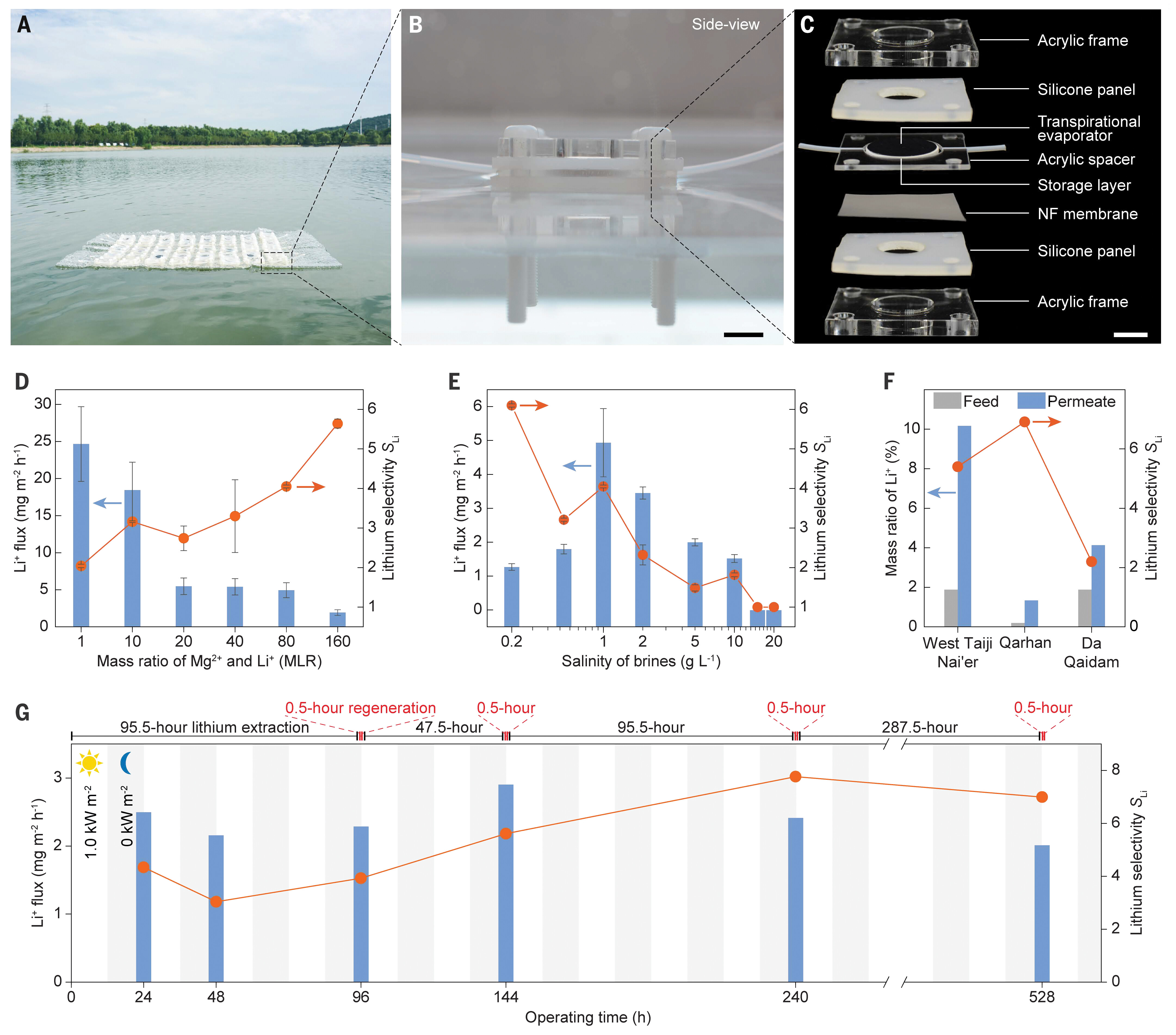 图1.太阳能蒸腾驱动的锂提取和储存(STLES)装置的概念与设计© 2024 AAAS
