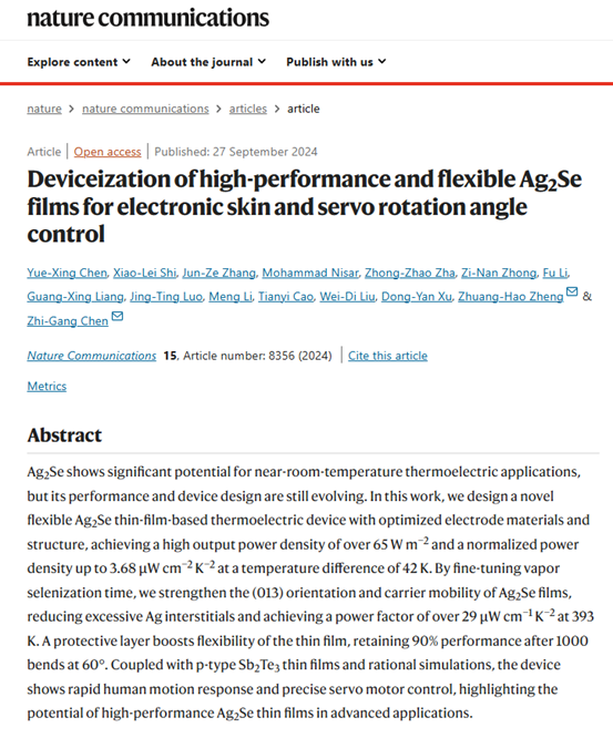 本研究创新性地采用了热扩散工艺来实现柔性硒化银薄膜材料的制备,通过调控优化相关制备流程,最终我们在柔性PI基底上的Ag前驱体薄膜制备了Ag2Se薄膜,通过优化工艺获得了(013)择优取向的Ag2Se薄膜。最终在363 K时实现接近30 μW cm−1 K−2的功率因子(在室温下为23 μW cm−1 K−2),通过涂覆层来实现了薄膜器件的机械性能的优化,最终在单n型7腿面内传导器件上实现了42 K的温差(ΔT)下其输出功率密度(ω)高达65 W m−2(图1),这也达到了有报道以来同类型的最高性能记录。