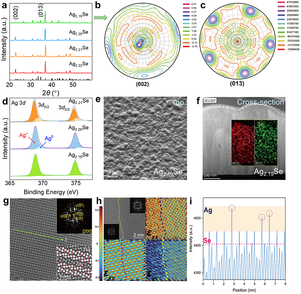 图2. 柔性AgxSe基薄膜表征。(a)Ag2Se薄膜XRD,(b-c)Ag2Se薄膜(002)方向和(013)方向极图。(d)X射线光电子能谱。(e) SEM表面形貌。(f)双球差高分辨透射电镜mapping图。(g) 截面双球差高分辨透射电镜图及FFT。(h)几何相位分析处理(不同方向)。(i)原子强度线扫描,(g)图中的黄线。