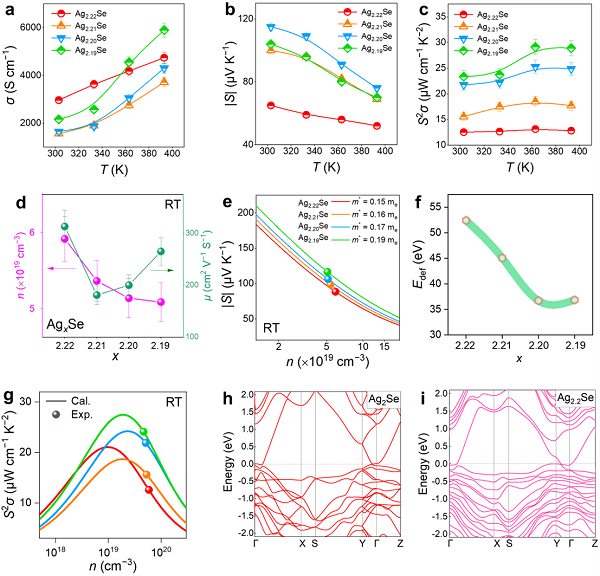 图3.柔性薄膜表征。(a)电导率。(b)绝对塞贝克系数。(c)功率因子。(d)不同Ag比例下的载流子浓度及迁移率。(e)有效质量与绝对塞贝克系数关系。(f)变形能。(g)载流子浓度与计算功率因子。(h-j)Ag2Se与Ag2。2Se能带结构。