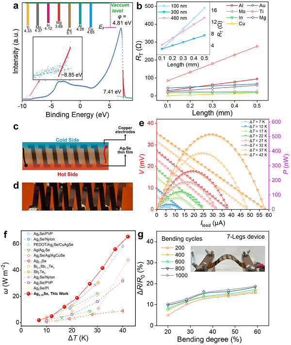 图4. Ag2Se薄膜器件性能。 (a) 紫外光电子能谱。(b) 电极选型。(c) 器件示意图。(d)器件实物图。(e) 输出功率。(f) 输出功率密度。(g) 弯曲度测试。