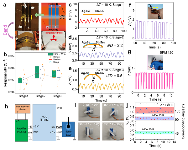 图5. Ag2Se柔性热电传感器。 (a) 实物图与示意图展示使用场景。(b) 器件灵敏度。(c-e) 不同弯曲程度下器件的输出性能。(f-g)不同人体部位应用下的信号输出。(h) 测量设备原理示意图。(i) 实现舵机控制示意图。(j) 不同温差下信号稳定程度。