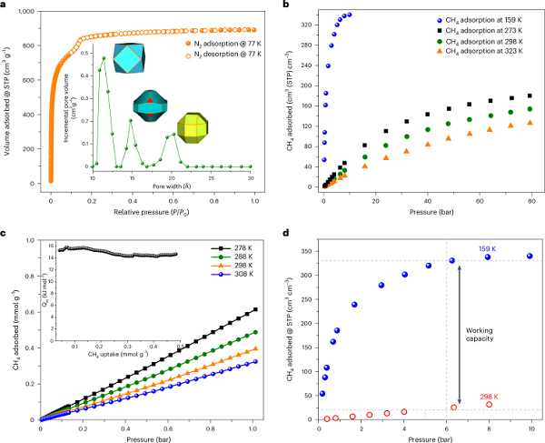基于此,浙江大学陈志杰研究员团队在Nature Synthesis上发表了题为“A hetero-supermolecular-building-block strategy for the assembly of porous (3,12,24)-connected uru metal–organic frameworks”的论文,提出了异质化超分子构筑模块策略(Hetero-SBBs),即在网络结构中同时引入两种金属有机多面体作为构筑基元,从而创建了高连接的三元网络结构:3,12,24-连接uru网络。研究人员采用一种灵活的连接剂—基于有机笼的羧酸盐,成功地将基于Cu-桨轮的立方八面体(cuo)和菱形八面体(rco)MOPs组装成一个三维的uru骨架。所得到的uru-MOF-1具有分层的微孔和介孔笼,展现出BET面积为3170 m2 g-1,实验孔体积(PV)为1.38 cm3 g-1的优异孔隙度。研究结果显示,uru-MOF-1在159 K和10 bar条件下的甲烷吸收量达到339.6 cm3 (STP) cm-3,使其成为一种极具潜力的低温甲烷储存材料。此外,在6 bar、159 K和5 bar、298 K之间的工作容量为309.4 cm3 (STP) cm-3。通过合成的MOPs库,利用异构SBB策略为设计合成高连接MOF铺平了道路。