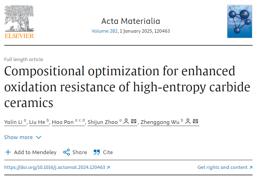 近日,湖南大学吴正刚教授和香港城市大学赵仕俊教授团队合作探索了高熵碳化物陶瓷中各个组分的微观氧化动力学,旨在通过成分优化进一步提升高熵碳化物的抗氧化性能。在这项研究中,科研团队通过理论计算框架指导对抗氧化HEC的成分优化,并通过氧化实验对理论预测进行验证,为HECs的成分设计提供了理论指导。相关成果以“Compositional optimization for enhanced oxidation resistance of high-entropy carbide ceramics” 在《Acta Materialia》上发表。