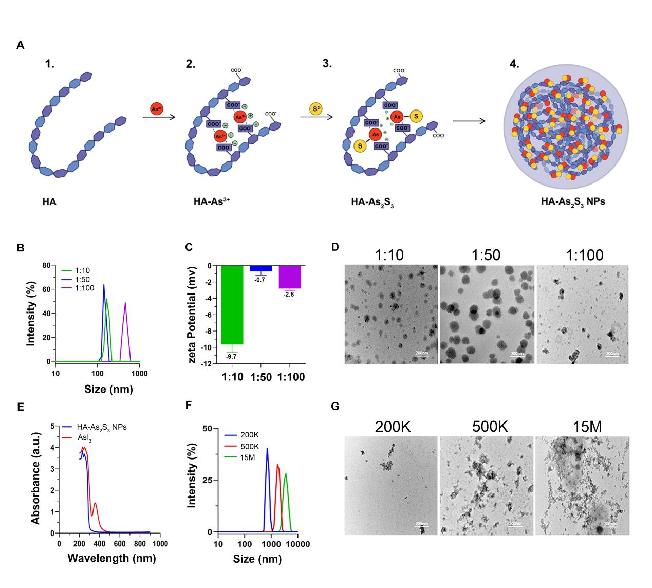 图1 HA-As2S3纳米颗粒合成示意图(A)及物理表征结果。B,C,D)10 kDa HA与砷离子在不同的HA/As3+比例下合成的HA-As2S3NPs的DLS和zeta电位分析以及透射电镜(TEM)成像。比例尺: 200 nm。当比例为1:50的时候为最佳合成比。 E) HA-As2S3NPs的紫外-可见光谱。F,G)高分子量HA(200kDa、500kDa、15MDa)在HA/As3+比例为1:50时形成的纳米粒的DLS分析和TEM图像。比例尺: 200 nm。