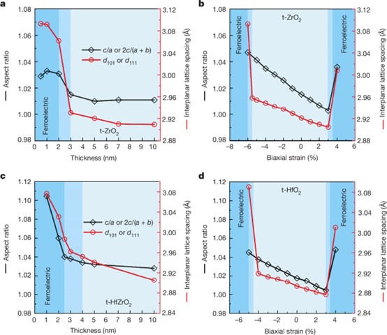 图4 在硅衬底上外延生长的ZrO2和Hf0.8Zr0.2O2超薄薄膜中,由非极性t相到极性o相的薄膜诱导铁电相变与外延应变诱导的铁电相变的比较。© 2024 Nature