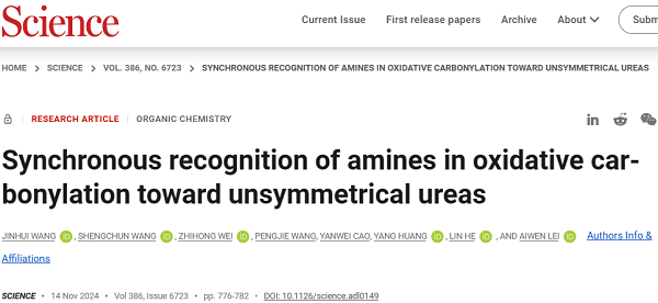 原文详情:Synchronous recognition of amines in oxidative carbonylation toward unsymmetrical ureas (Science, 2024, 386, 776-782)